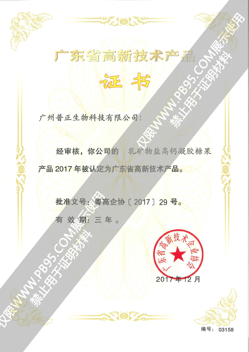 乳礦物鹽高鈣凝膠糖果——17年高新技術(shù)產(chǎn)品證書(shū)