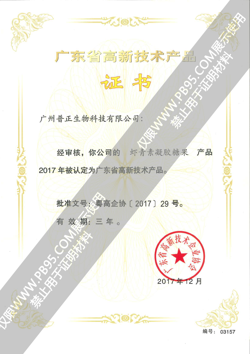 蝦青素凝膠糖果——17年高新技術(shù)產(chǎn)品證書(shū)