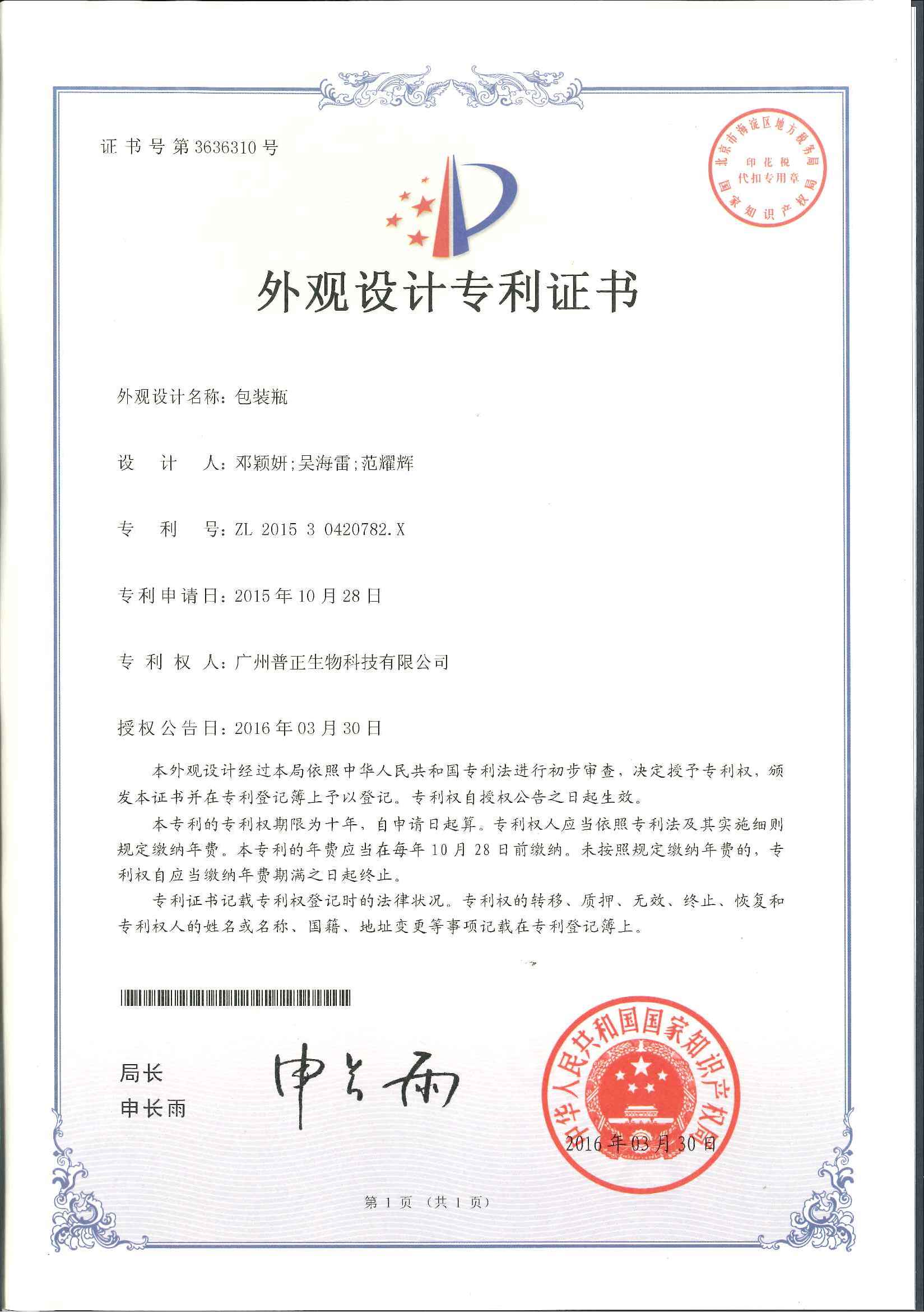 普正包裝專(zhuān)利證書(shū)(專(zhuān)利號(hào):ZL201530420782.X)