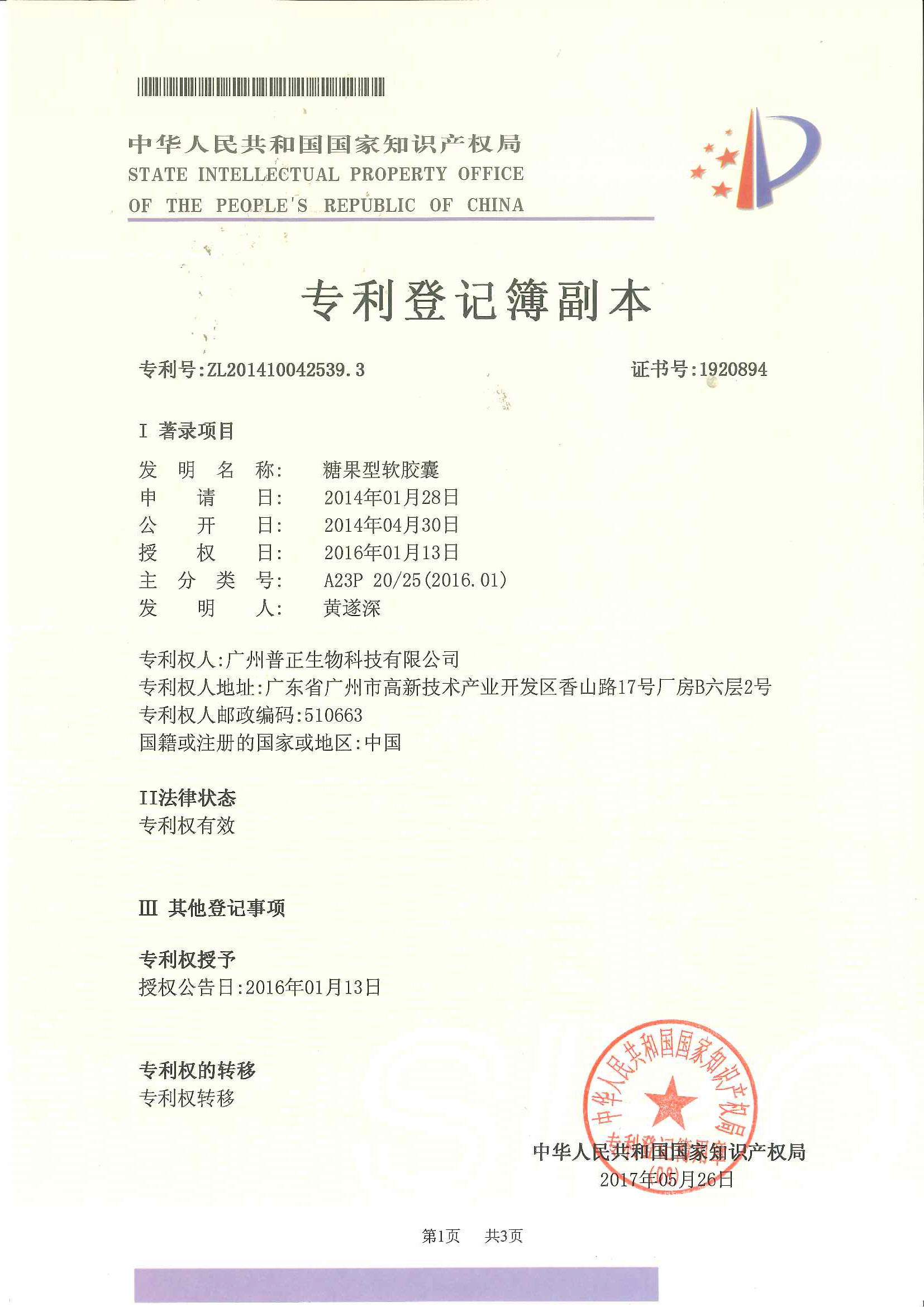 糖果型軟膠囊專(zhuān)利證書(shū)(發(fā)明專(zhuān)利號(hào):ZL201410042539.3)
