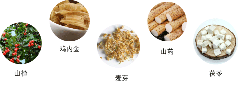 主要營養(yǎng)原料:山楂粉(5%)、雞內(nèi)金粉(1.4%)、麥芽粉(0.7%)、山藥粉(1.4%)、茯苓粉(1.4%)