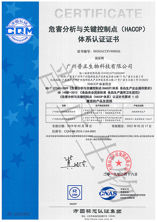 2019年2月18日,普正生物收到了《危害分析與關(guān)鍵控制點(HACCP)體系認證證書》,這是由國家認證認可監(jiān)督行政主管部門批準,由北京方圓標志集團進行嚴格檢查審核并頒發(fā)的權(quán)威認證證書,有效期三年。