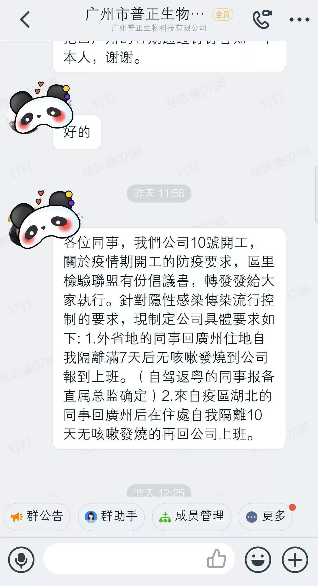 今天是廣東省企業(yè)復工的第一天,廣州市黃埔區(qū)防控新型冠狀病毒感染的肺炎疫情工作領導小組企業(yè)復工復產工作組下發(fā)了關于持續(xù)做好疫情防控期間企業(yè)復工復產的通知,為了維護我司企業(yè)員工的生命權益,為了盡快恢復正常生產秩序讓客戶放心,普正生物嚴格落實本企業(yè)疫情防控主體責任,嚴格按照市、區(qū)疫情防控指揮部決策部署和區(qū)“兩清單一指引”落實落細檢疫查驗、健康保護和安全生產措施。下面就來看看我們做了些什么吧: