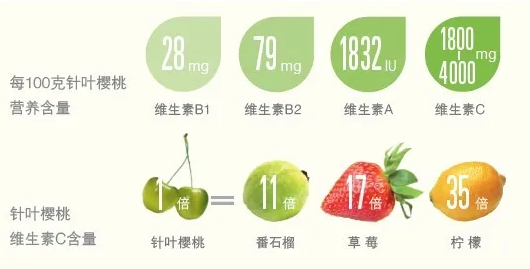針葉櫻桃富含維生素C,每100克果肉就含有1800-4000毫克超高量維生素C,是目前種植的