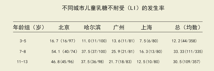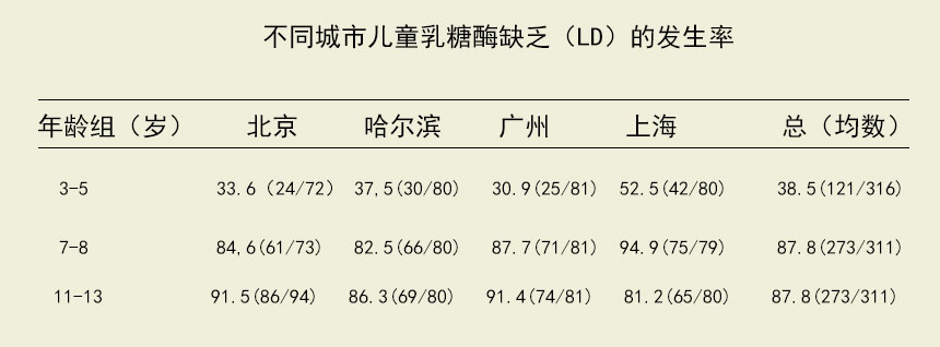 小孩子發(fā)生這種癥狀并不少見(jiàn)。1999年中國(guó)營(yíng)養(yǎng)學(xué)會(huì)楊月欣等在哈爾濱、北京、上海和廣州四大城市對(duì)3—13歲兒童隨機(jī)抽取1168名,進(jìn)行乳糖不耐測(cè)試,結(jié)果表明, 我國(guó)兒童乳糖不耐缺乏(LD)的發(fā)生率有隨年齡增長(zhǎng)而升高的趨勢(shì),發(fā)生率在兩位數(shù)以上。
