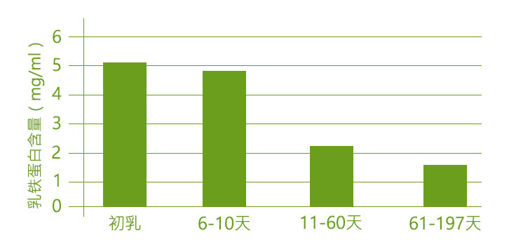 研究表明,作為母乳的重要組成部分,乳鐵蛋白在人初乳中可達(dá)6-14mg/ml,而正常母乳中1-3.2mg/ml,牛乳中含量?jī)H0.02—0.35mg/ml。